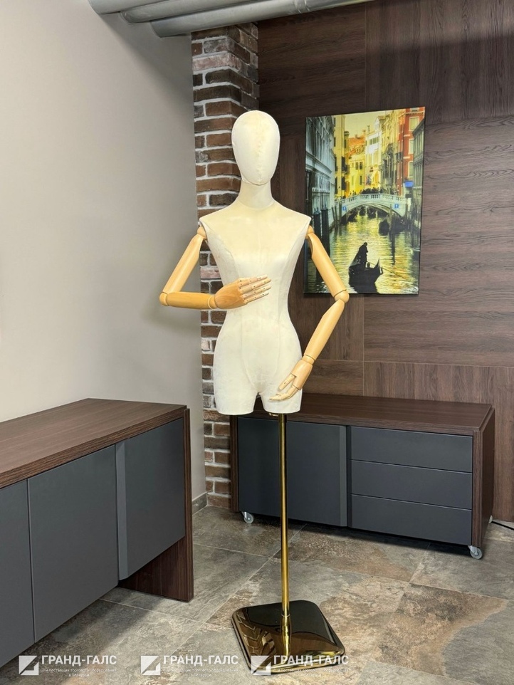 M-133 Манекен торс демонстрационный женский, шарнирные руки дерево на подставке, велюр/золото