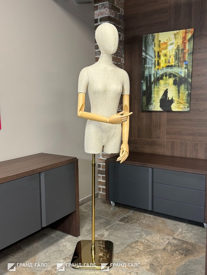 M-133 Манекен торс демонстрационный женский, шарнирные руки дерево на подставке, велюр/золото